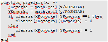 Funkcja przelacz pobiera współrzędne myszki. Musimy ustalić, która komórka odpowiada tym współrzędnym, dlatego dzielimy je przez rozmiar. Ponieważ to może dać ułamek, zaokrąglamy go w górę funkcją wbudowaną math.ceil(liczba). Potem odpowiednio dana komórka przybiera wartość 0 (martwa) lub 1 (żywa).