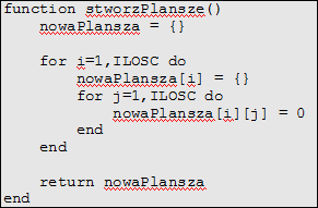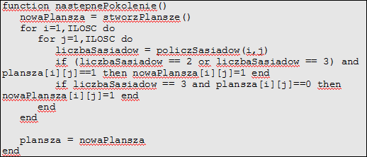 Od początku. Potrzebujemy nową macierz o takim samym rozmiarze jak plansza z wartościami 0. Wystarczy skopiować kod z funkcji start(). Aby jednak kod był łatwiejszy w czytaniu podzieliłem go na funkcje, i tak funkcja stworzPlansze() zwraca macierz z wartościami 0. Za chwilę podam jej kod. Dalej przechodzimy przez wszystkie komórki i liczymy jej sąsiadów za pomocą funkcji policzSasiadow, która pobiera współrzędne komórki. Potem postępujemy zgodnie z regułami gry. „Jeśli komórka ma dwóch lub trzech sąsiadów i jest żywa (wartość 1), to dalej (na nowej planszy) dalej jest żywa”. „Jeśli komórka ma trzech sąsiadow i jest martwa (wartość 0), to ożywa (na nowej planszy)”. Potem już tylko aktualizujemy zmienną plansza.