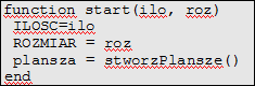 Ten kod rzeczywiście jest już nieco bardziej zawiły, ale wcale nie trudny! Na początku deklarujemy tablicę o nazwie plansza, zmienne ILOSC i ROZMIAR, a potem funkcję start, która przyjmuje parametr ilość i rozmiar. Ilość to liczba komórek w rzędzie, a rozmiar to rozmiar jednej komórki. Potem w tej funkcji ustawiamy w tablicy wartości 0 dla wszystkich komórek.