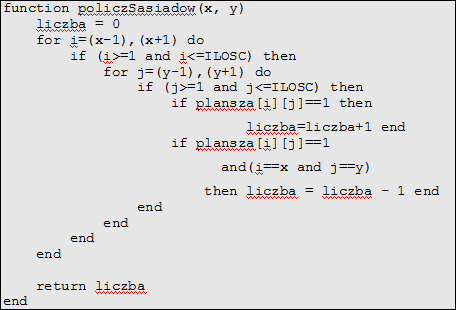 Na początku zmiennej liczba ustalamy wartość 0. Będzie ona przechowywała liczbę sąsiadów. Potem mamy pętlę, która przechodzi przez kolumnę z lewej, kolumnę, na której jest komórka i kolumnę z prawej. Musimy jednak pamiętać, że przy sprawdzaniu sąsiadów dla komórki (1; 4) zmienna i przybiera wartości 0, 1 i 2. Nie istnieje kolumna 0, dlatego musimy sprawdzić czy i jest większe od 0 i czy na pewno i jest mniejsze lub równe ilości kolumn. Potem kolejna pętla, która działa identycznie jak poprzednia, tylko dla wierszy. Podobnie jak wcześniej sprawdzamy czy wiersz istnieje (większy od 0 i mniejszy lub równy ilości wiersz). Jeśli te warunki są spełnione, sprawdzamy czy dana komórka żyje. Jeśli tak dodajemy jeden do zmiennej liczba. Jednak w ten sposób policzylibyśmy też komórkę, dla której sprawdzamy, a ona nie jest sąsiadem. Dlatego kolejny warunek „jeśli komórka żyje oraz i jest takie samo jak x oraz j jest takie samo jak y → odejmij 1 od liczby komórek”.